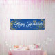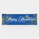 Este cartel de vacaciones se muestra en el interior. Seleccione entre interior o exterior, con o sin mangas. Mostrado en azul con el texto en blanco "Happy Hanukkah" en un guión elegante con dos estrellas de aspecto dorado en cada extremo. Personalizar o compra según el diseño.