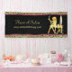 Crea un toque de glamour con este elegante banner de estilo boutique de diseño de estampado de chita dorado y negro de 2 pies de alto con una silueta dorada de una mujer con el pelo largo y ondulado. ¿Quién puede resistir un par de zapatos rosados modernos con arcos? Ella admira su reflejo en un espejo de vanidad. Personalice este diseño de impresión animal de moda añadiendo el nombre de su salón de belleza y de peluquería y estilista estético o de pelo. Imagen plana impresa, NO metálica reflectante.