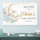 Personalize this whimsical bunny rabbit welcome backdrop banner with your own wording easily and quickly, simply press the customize it button to further re-arrange and format the style and placement of the text. Featuring a sweet baby bunny sleeping on a blue floral and greenery adorned crescent moon. Matching items available in store! (c) The Happy Cat Studio