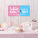 Chica del equipo o cartel azul en rosa y azul para un fiesta revelador de género. Diseño moderno con cigüeñas que dan a luz a un bebé. Personalízalo con los nombres de los futuros padres y la fecha.