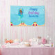 Banner marino bajo el agua del chica de sirenas negras para tu fiesta de cumpleaños de niños bajo el mar. Honra a tu pequeña chica afroamericana que adora las sirenas de pelo púrpura con esta hermosa decoración personalizado fiesta con un hermoso texto personalizado azul y púrpura sobre el agua encima del colorido coral del océano. Un fiesta de la piscina infantil.
