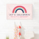 Bienvenido a sus huéspedes con este lindo banner fiesta personalizado. Este banner moderno y alegre tiene un motivo de arco iris azul, rosa y coral y verde azulado. El texto es todo personalizable. Parte de una colección de Parcel Studios.