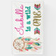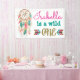 Un banner salvaje de un primer cumpleaños con una pluma de bonito que capta el sueño y el guión dorado uno. Puedes añadir el texto de tu elección para personalizar este adorable banner de la fiesta tribal de cumpleaños para tu evento.