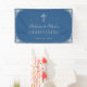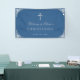 Un diseño religioso para el bautizo de un niño. El fondo es azul clásico. Hay un marco falso de color Relieve metalizado plateado vintage y (falso) cruz de plata encima del texto. El mensaje "Bienvenidos a [Name]'s" está escrito en un guión caligráfico elegante, el resto en mayúsculas. Todo el texto es gris. El marco vintage, ornamentado, se basa en un enlace de portada de libros antiguos franceses, de Georges Mercier (1885-1939) - Madame de Maupin por Theophile Gautier, edición 1911, ahora de dominio público.