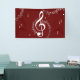 G Clef entre notas de música en un rojo profundo. El fondo rojo oscuro hace que aparezcan las notas blancas brillantes. Diseño de música blanca y marrón,
