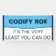 Codificar Roe es lo menos que puedes hacer. Codificar Roe debería ser el piso de los derechos de salud de las mujeres, no el techo. Y ahora, incluso eso no existe. Díganle al Congreso que es hora de que hagan lo menos que puedan por la salud, la seguridad y la igualdad de las mujeres, porque las mujeres son personas y el aborto, sea cual fuere la razón, es la atención médica. Descripción del diseño: el espacio de diseño es un fondo blanco con un borde azul oscuro. En la mitad superior del espacio de diseño, las palabras "Codificar la ruta" en una fuente sans serif azul oscuro. Debajo, una amplia franja azul claro con bordes superiores e inferiores azul oscuro. Debajo de la franja, en la mitad inferior del diseño, las palabras "Es lo menos que se puede hacer" en dos líneas.