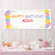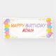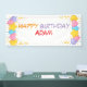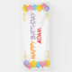 Un diseño interior vibrante y festivo de carteles de cumpleaños con globos brillantes coloridos, cintas metálicas y confetti dispersos a lo largo de los bordes superior e inferior. El diseño deja un amplio espacio en blanco en el centro para una fácil personalización. Perfecto para decoraciones digitales o impresas de cumpleaños, esta alegre obra de arte de estilo personalizado utiliza colores pastel brillantes con acentos dorados y plateados para crear un ambiente alegre de celebración. Tamaño de 2,5 por 6 pulgadas con un fondo transparente para un uso versátil.