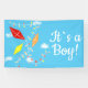 Cometas en el cielo, es un cartel de boy Baby Shower. El diseño de la ducha es muy bonito, con tres cometas en tonos rojos, amarillos y naranjas. Las cometas están volando en el cielo entre nubes. Es un chico de escritura blanca de moda.