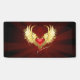 Corazón rojo brillante de un ángel con alas doradas brillando en el fondo rojo oscuro y radiante decorado con un patrón.