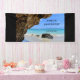 Banner de negocios con una fotografía panorámica de la naturaleza. Bonito mar azul turquesa con una playa de arena. Una gran roca marrón da sombra al cielo azul intenso.