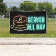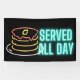 Texto de Neon Served All Day con el símbolo de pila de crepes sobre fondo negro. El desayuno se sirve durante todo el día en el restaurante, cafetería, bistró o food truck, que es un gran diseño.