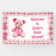 Pink and white crocheted teddy bear girl's baby shower personalized welcome banner. An adorable pink teddy bear crocheted with pink and white yarn adds the sweetest touch.