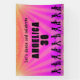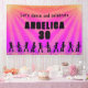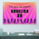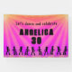 Un vibrante banner o telón de fondo para la pared de fotos. El texto y el nombre son personalizables para el invitado de honor. Bailarines de disco en silueta en la pista de baile con brillo y focos en un fondo vibrante de púrpura, rosa y naranja.