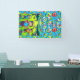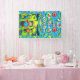 Banner personalizado de la fiesta de cumpleaños del niño con la edad y el nombre del niño. El fondo son los discos rojos, azules y verdes.