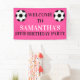 Dos grandes pelotas de fútbol abren las esquinas superior izquierda y derecha de este cartel que da la bienvenida a los invitados a la fiesta de cumpleaños de sus hijas de fútbol. Personalice la edad y la redacción para su ocasión.