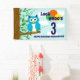 ¡Mira quién está teniendo un cumpleaños! Un búho azul divertido en una escena boscosa con cielo azul y nubes esponjosas