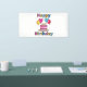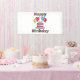 Esta pancarta muestra las palabras "Feliz Cumpleaños" en una fuente de letra negrita con letras de diferentes colores y contorno negro que presenta una torta de cumpleaños con velas y globos en este tema y estilo de cumpleaños. Esta pancarta tiene impresión en un solo lado, medidas seguras para exteriores de 2 "x1", está hecha con un acabado mate elegante y es resistente a la decoloración y desgarro para uso en interiores o exteriores, ideal para anunciar cualquier cosa, desde cumpleaños hasta graduaciones, bodas y aniversarios. Bordes doblados y soldados térmicamente para un acabado limpio, las pancartas para exteriores se pueden comprar con ojalillos metálicos.