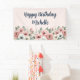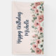 Esta elegante pancarta de cumpleaños floral presenta un suave fondo rosa con un exuberante ramo de flores de acuarela en tonos rosa, marfil y salvia a lo largo del borde inferior. La elegante letra cursiva navy dice "Feliz Cumpleaños Michelle", creando un look atemporal y sofisticado que complementa cualquier celebración femenina. Perfecta para cumpleaños importantes, fiestas de jardín o reuniones elegantes en interiores, esta pancarta personalizable añade un toque elegante a tu decoración y coordina perfectamente con suministros para fiestas florales a juego.