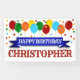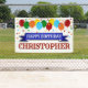 Banner de vinilo alegre y colorido para tu celebración de cumpleaños! Este diseño presenta una divertida selección de globos de color primario (rojo, verde, azul, amarillo y naranja) con un cartel azul de "feliz cumpleaños".