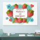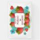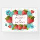 Celebra tu cumpleaños con esta divertida pancarta de fresa. En el centro de la pancarta hay plantillas para agregar todos tus detalles dentro de una caja blanca con un borde burdeos oscuro. Alrededor de la caja de detalles hay jugosas fresas rojas con hojas verdes. También esparcidas hay flores azules lindas y corazones de amor rosados.