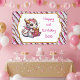 Un lindo dragón blanco, dorado y chibi rosado con una pancarta personalizada de la fiesta de cumpleaños de los chicas de cumpleaños.