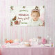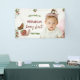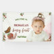 Adorned with vibrant red strawberries, lush green vines, a whimsical butterfly, and an adorable strawberry-patterned snail, the design beautifully captures the essence of a charming berry patch. The playful script "berry first" perfectly complements the customizable text: "WELCOME TO [Child's Name]'s BIRTHDAY." This banner is designed to make a memorable statement and become a treasured keepsake from your baby's very special first birthday!