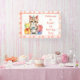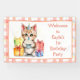 Un banner de bienvenida dulce para una fiesta de cumpleaños en pin y amarillo con un gatito en un gorra de cumpleaños. El fondo seleccionado y todo el texto se pueden personalizar.