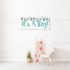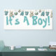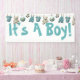 Decoraciones de recién nacido Boy. Bienvenidos a casa la pareja feliz con esta adorable pancarta de It's A Boy. Los colores azul y blanco. Oso de peluche y ropa adorables colgando de una fila.