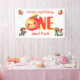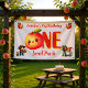 Decora tu espacio de celebración con este cartelón caprichoso de cumpleaños número uno. El diseño presenta una escena encantadora de cuento con un personaje de durazno kawaii, un gnomo de jardín y una niña de la cosecha en un huerto soleado. Cuelga este telón de fondo vibrante detrás de la mesa de postres o la silla alta para crear una oportunidad perfecta para fotos en el gran hito de tu hijo.