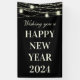 Este cartel de Deseándote un Feliz Año Nuevo muestra luces de cuerdas y tarros en un fondo negro. Personalizarlo con el año.