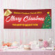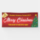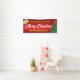 Banderín de Feliz Navidad sobre fondo rojo brillante con árbol y campanas. Edite todo el texto. Ideal para un desfile de Navidad o una exhibición en tienda.