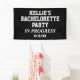 ¡Prepárate para celebrar con nuestro "Banner de Despedida de Soltera en Curso"! Haz saber a todos que la fiesta está en marcha y prepárate para pintar la ciudad con estilo de despedida de soltera. ¡Ordena este banner hoy y haz que la última noche de la novia antes del anillo sea una noche inolvidable!