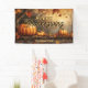 Esta pancarta de Acción de Gracias presenta una hermosa escena de un bosque otoñal cubierto de sol. Un trío de calabazas descansa en un tronco rústico de madera, rodeado de hojas dispersas en tonos cálidos y tierra. El elegante guión de "Feliz Día de Acción de Gracias" y el nombre de la familia de personalizables de abajo hacen de esto una decoración personalizada y atractiva, perfecta para crear un ambiente acogedor y festivo.