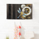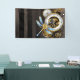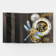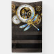 Diales antiguos de oro y bronce, decorados con libélula mecánica sobre fondo marrón, rayado. Steampunk.