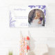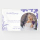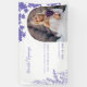 Una invitación boda con una novia sonriente sosteniendo un ramo de flores de lavanda. El texto dice, "Hermosos comienzos - 'El amor está compuesto de un solo alma viviendo en dos cuerpos.' Callahan & Ava, 09 de julio de 2024." Gráficos florales de lavanda adornan los bordes de la tarjeta.