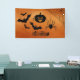 Diseño de Halloween con calabaza negra malvada, murciélagos y araña sobre un fondo naranja