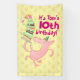 Un cerdo feliz en una pancarta de cumpleaños. Utilice "Personalizar esta plantilla" y cambie el nombre y la edad, creando un elemento único y personalizado. Una pancarta con un cerdo alegre, debajo de una tarta de capa hirviendo con azotes de hielo verde y coronada con velas rosas.