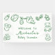 Bienvenida para baby shower estilo doodle en verde suave y blanco que presenta una ilustración caprichosa de una cigüeña dibujada a mano y letras juguetonas, creando un punto focal cálido y acogedor para tu celebración. Contra un fondo blanco crujiente, el texto de estilo libre y el arte de boceto traen un encanto casual y moderno que es perfecto para una fiesta de bebé neutral en cuanto al género. El diseño minimalista y la paleta de colores suaves hacen que este banner sea ideal para decorar entradas, mesas de regalos o fondos para fotos mientras mantiene una estética coherente con otra decoración de baby shower temática de doodle.