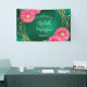 Una delicada ilustración de acuarela que presenta un marco geométrico dorado sobre un fondo verde esmeralda. El marco está adornado con vibrantes crisantemos rosados intensos colocados a lo largo de los bordes exteriores. Todo el diseño tiene una textura suave de acuarela, combinando elegancia con un toque floral natural.