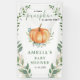 Este fondo de baby shower presenta una calabaza acuarela y una corona de follaje dorado de vegetación otoñal.
