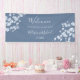 Boda en la recepción con una tabla de asientos con flores azules de cerezo blanco sobre un polvoriento fondo azul. Un texto de bienvenida y los nombres de sus novios y novios en una elegante letra manuscrita.