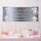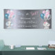 Por un sexo revelan fiesta. Un falso fondo metálico plateado. Decorada con globos purpurina y azul, rosa y blanco. Un elefante de bebé y una elefante de bebé. Personaliza y agrega el nombre de los padres. El nombre y el texto: ¿Niño o Chica? están escritos con una escritura de estilo con letras a mano