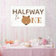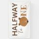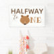 Un cartel de medio cumpleaños para tu bebé. Celebra los primeros seis meses de tu bebé con este lindo cartel. Tiene un esquema de color blanco y marrón con la palabra "Uno" incluyendo el ilustracion de cara de oso como primera letra de la palabra. Simplemente agrega este cartel a tu carrito, ¡y feliz medio cumpleaños a tu maravilloso bebé! A mitad del camino de One Banner Holiday Design | ©Melissa Patton - Artista/Ilustrador