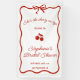 Brillante, audaz y lleno de encanto, este diseño de pancartas "Ella es la cereza en la parte superior" presenta texto rojo juguetón y ilustraciones en un fondo blanco y nítido. Un marco ondulado y dibujado a mano rodea la disposición caprichosa, coronada por un arco dulce y centrada por un alegre par de cerezas. El divertido guión y el alegre tema de la fruta crean un ambiente retro de moda, perfecto para duchas nupales o eventos de celebración. Los campos de personalizable le permiten agregar el nombre del evento, la fecha y la ubicación, haciendo de este cartel una pieza decorativa destacada con personalidad y estilo.
