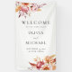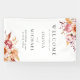 Pancarta de bienvenida boda con adornos florales de moda boho de flores dahlia y hojas botánicas otoñales. Fácil de personalizar con los detalles de su boda para saludar a sus huéspedes en una elegante tipografía minimalista.