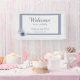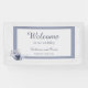 Una elegante pancarta de bienvenida boda con flores de color azul claro y azul marino sobre un fondo azul polvoriento claro. Es perfecto para una celebración de bodas de invierno.