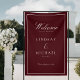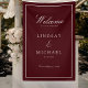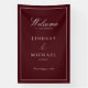 Elegante pancarta de boda con fuente escrita en Burgundy y Blanco con sus nombres, fecha y texto.