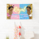 El Adorable Príncipe y Princesa Africana en un fondo de bloque de color rosa y azul con Purpurina de oro en los lados del cartel. Personalizar con el nombre de mamá y papá. El color no se puede cambiar. ¡Perfecto para tu Baby Shower Real de Revelación de Género! ©2020 Señales de Miss Fiesta Sassy