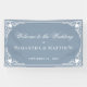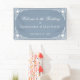 Banner elegante de bienvenida nupcial con un aire vintage, con colores bodas polvorientos azules y blancos. En las esquinas hay un marco vintage con decoraciones antiguas. El mensaje "Bienvenidos al Boda" está escrito en un elegante guión caligráfico, el resto en mayúsculas. El texto y el marco antiguo son blancos, el fondo es azul polvoriento. El marco vintage, ornamentado, se basa en un enlace de portada de libros antiguos franceses, de Georges Mercier (1885-1939) - Madame de Maupin por Theophile Gautier, edición 1911, ahora de dominio público.
