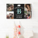 Este elegante banner de graduación de monograma presenta un fondo negro con una plantilla de 4 collage de fotos del graduado, un gorro de graduación blanco, año de clase, lugar de estudio y inicial y nombre en escritura caligráfica manuscrita. El color de la inicial se puede personalizar pulsando en "Personalizar más adelante".